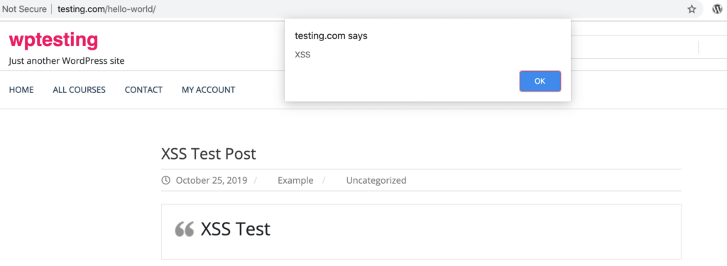 When the testimonial is added to a page on the site, the XSS payload passed in both of the above mentioned vulnerable parameters get executed.